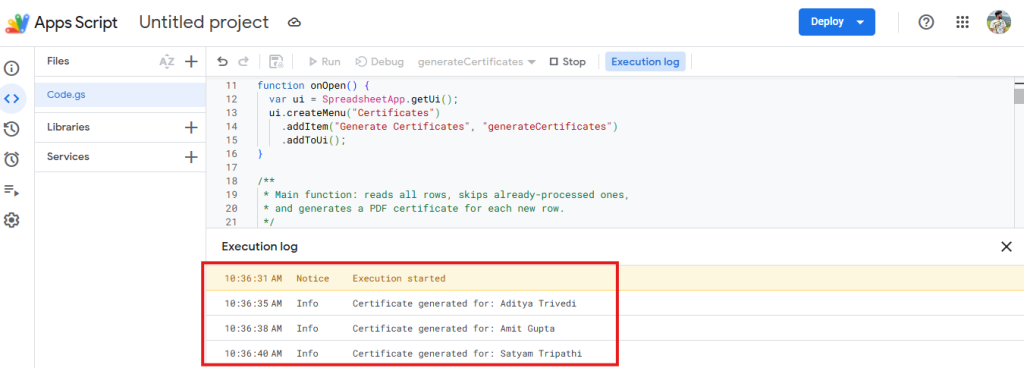 Apps Script execution log after running the generateCertificates function