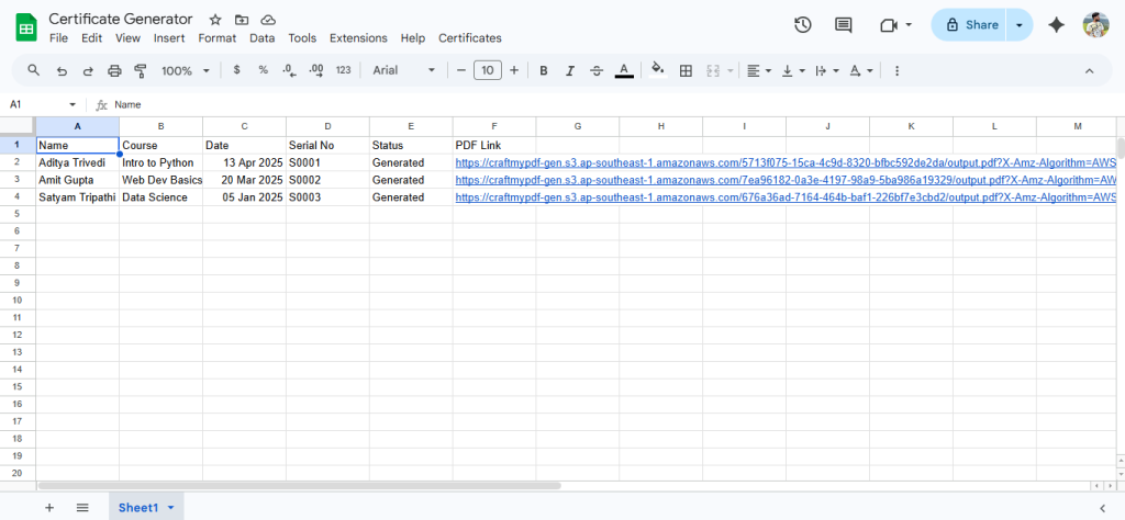 Only fill in Name, Course, Date, and Serial No. Leave Status and PDF Link empty, the script fills those automatically.