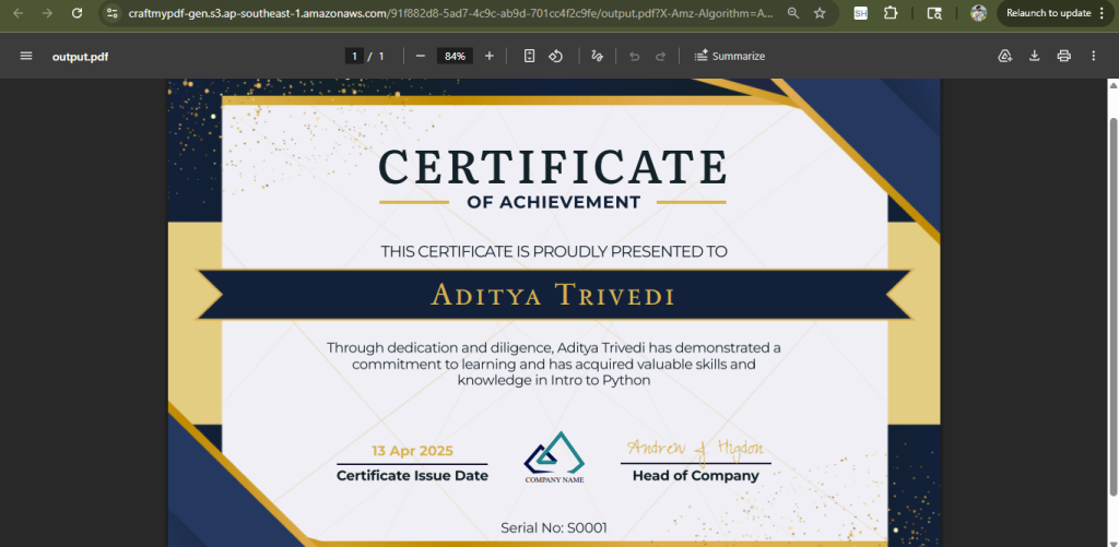 Opening the generated PDF link for Aditya Trivedi’s certificate in the browser