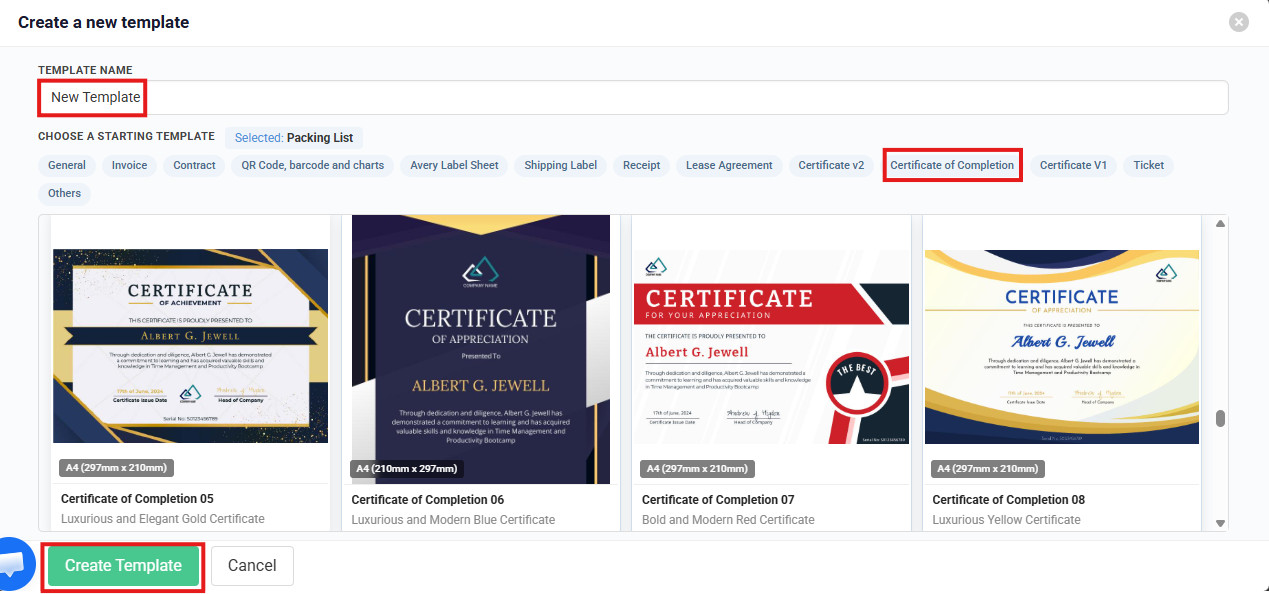Create a new template dialog showing the Template Name field, Certificate of Completion tab selected, and available certificate designs