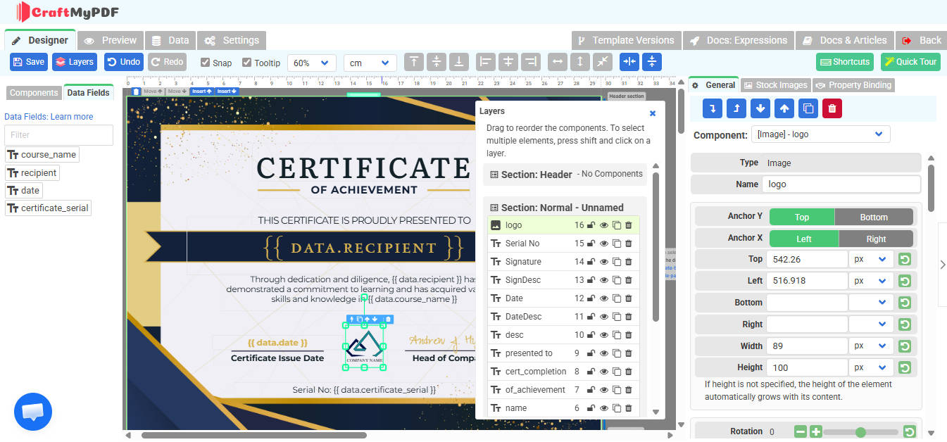 The CraftMyPDF drag-and-drop editor showing the certificate template, Data Fields panel on the left, and Layers panel in the center