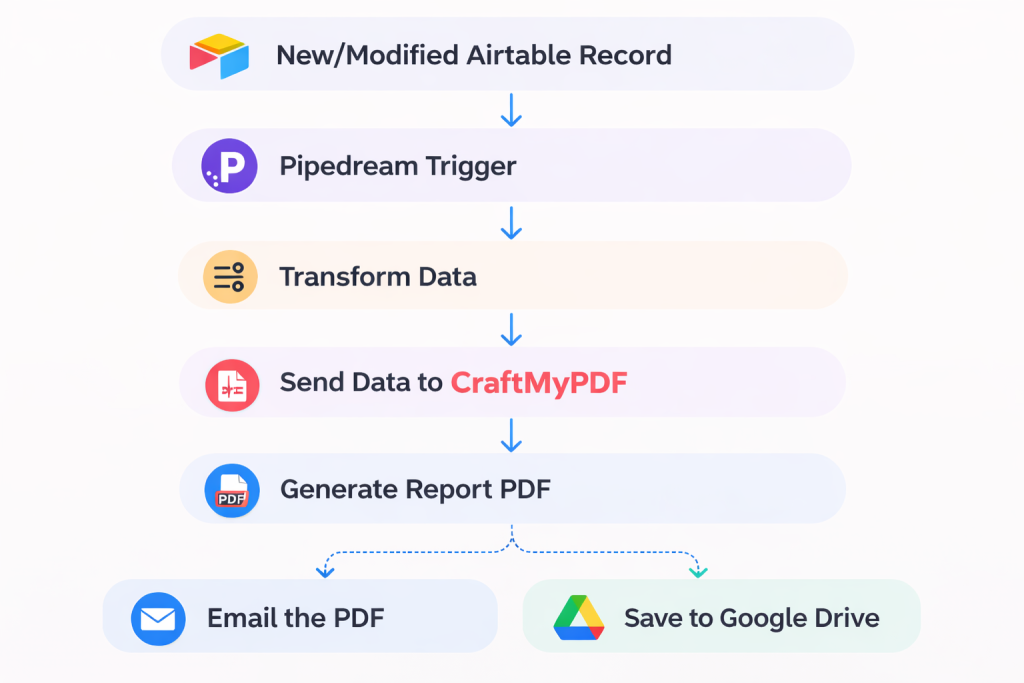 In this tutorial, we walked through how to automatically generate PDF reports using Airtable, Pipedream, and CraftMyPDF. From structuring your Airtable database, to setting up a trigger in Pipedream, and finally generating a PDF using a CraftMyPDF template, you now have a complete workflow that runs automatically with little to no manual effort.