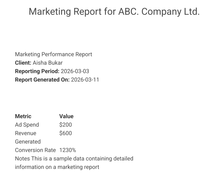 iv. Reports: Teams often need to convert structured data into reports. For example, data stored in Notion, Airtable, or Google Sheets can be automatically transformed into professional PDF reports for internal reviews or client presentations.