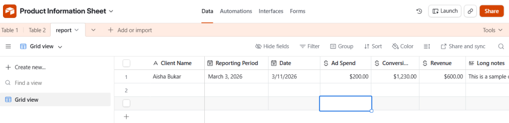 i. Airtable Set Up: You will need an Airtable base where the data for your reports will be stored. Each new record in this database will act as the trigger for the automation workflow. For example, the database might contain fields such as client name, Ad spend, Revenue, and any other information you want to include in the generated PDF.