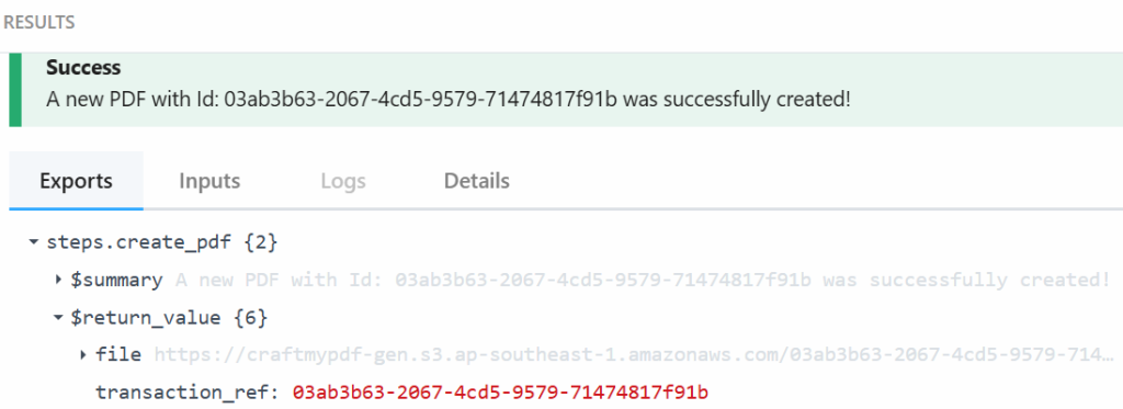 Proceed to test the workflow to make sure everything works. You should get a successful response as well as the URL information, template ID, expiration date, and other important information about the generated PDF.