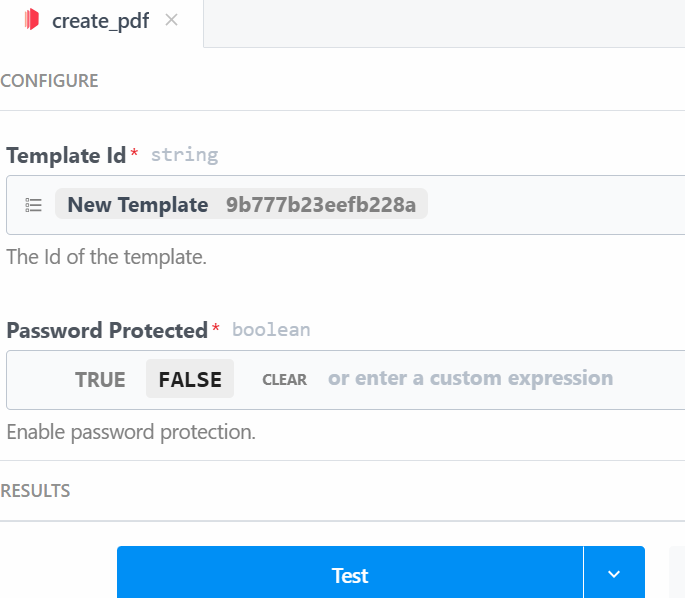 Then, you can set up a password for your PDF or just set it to FALSE since this is a test workflow.