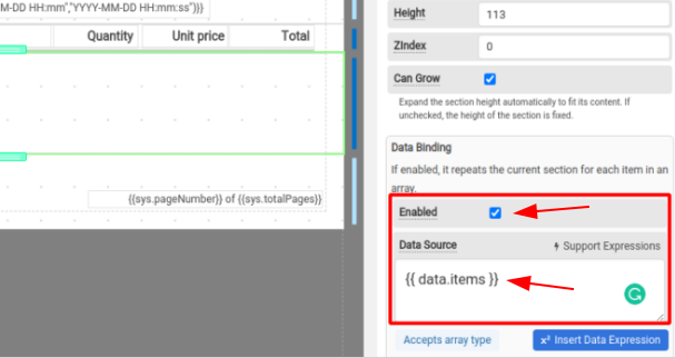 To enable data-binding for a section, select a normal section and in the Data binding selection, check on Enabled and use an expression to bind the JSON array to the Data Source.