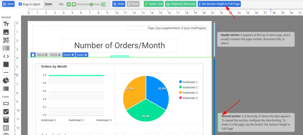 If Can Grow of a normal section is enabled, a normal section expands the section height automatically to fit its content. If unchecked, the height of the section is fixed.